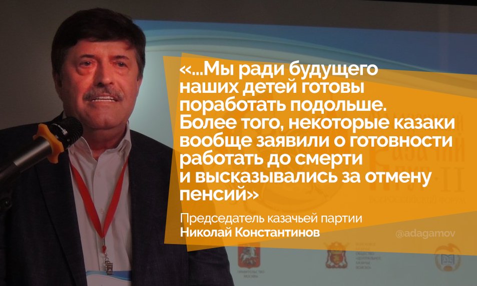 НА ФОНЕ ПЕНСИОННОЙ РЕФОРМЫ ВЛАСТИ УВЕРЯЮТ, ЧТО РОССИЯНЕ БУДУТ ЖИТЬ ВСЁ ДОЛЬШЕ И ДОЛЬШЕ. Сейчас средняя продолжительность жизни составляет 73 года, — сказал премьер-министр. Сейчас нужно работать на увеличение этого показателя, — отметил Дмитрий Медведев. «Прежде всего, необходима забота о здоровье людей старшего поколения. Это значит, что все возможные проблемы со здоровьем надо стремиться выявлять на ранних стадиях. Для этого должны быть увеличены масштабы диспансеризации, диспансерного наблюдения. В каждом регионе необходимо создать гериатрические центры для сохранения здоровья людей старшего поколения, и, конечно, сделать систему социального обслуживания и ухода за людьми старшего возраста современной и удобной. Это касается не только материально-технической базы, хотя она, скажем по-честному, у нас хромает во многих местах, но и методов работы. И здесь большое значение имеет участие социально-ориентированных общественных организаций в национальных проектах». Такие же цели обозначил и мэр Москвы Сергей Собянин. Он добавил, что через четыре года москвичи в среднем будут жить по 80 лет. https://echo.msk.ru/news/2245782-echo.html https://twitter.com/navalny ПРЕДСЕДАТЕЛЬ КАЗАЧЬЕЙ ПАРТИИ: Председатель Казачьей партии Николай Константинов и Путин: фото с сайта: http://станица-алексинская.рф/%d0%b1...0%d0%ba%d0%b8/ |