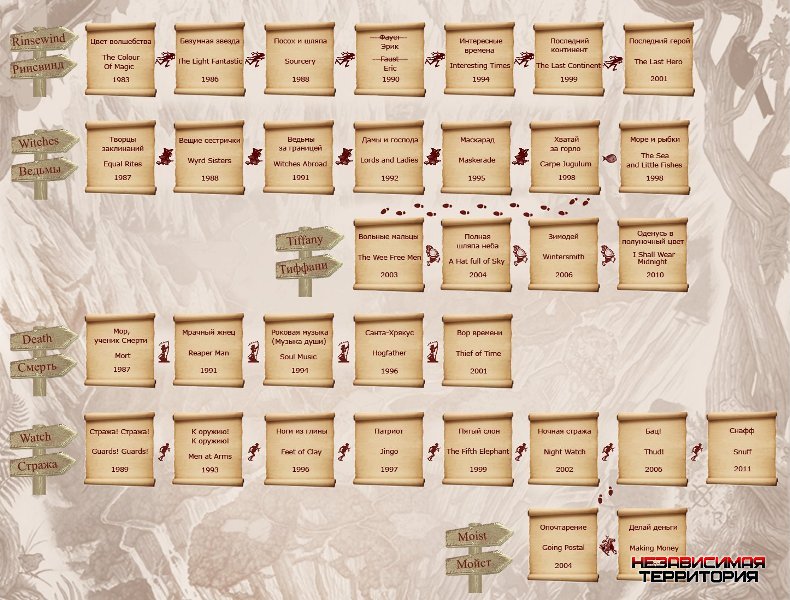 1992 Ветчина, ветчина/Jamón, jamón Сильвия 1992 Эра красоты/Belle epoque Лус 1992 Капкан/Framed Лола дель Морено 1996 Селестина/La Celestina Мелиби 1997 Живая плоть/Carne trémula мать Виктора 1997 Открой глаза/Abre los ojos София 1998 Разговор ангелов/Talk of Angels Пилар 1999 Всё о моей матери/Todo sobre mi madre сестра Роза 2000 Женщина сверху/Woman on Top Изабелла Оливейра 2001 Кокаин/Blow Мирта Джанг 2001 Выбор капитана Корелли/Captain Corelli's Mandolin Пелагия 2001 Нет вестей от Бога/Sin noticias de Dios Кармен Рамос 2001 Ванильное небо/Vanilla Sky София Серрано 2003 Шоу века/Masked and Anonymous Пэган Лейс 2003 Фанфан-тюльпан/Fanfan la tulipe Аделина ла Франшиз 2003 Готика/Gothika Хлое Сава 2004 Не уходи/Non ti muovere Италия 2004 Голова в облаках/Head in the Clouds Мия 2004 Ноэль/Noel Нина Васкес 2005 Сахара/Sahara доктор Ева Рохас 2006 Бандитки/Bandidas Мария Альварес 2006 Возвращение/Volver Раймунда 2007 Спокойной ночи/The Good Night Анна 2008 Элегия/Elegy Консуэла Костилло 2008 Вики Кристина Барселона/Vicky Cristina Barcelona Мария Елена 2008 Манолете/Manolete Лупе Сино 2009 Разомкнутые объятия/Los abrazos rotos Лена 2009 Миссия Дарвина/G-Force морская свинка Хуарес (озвучка) 2009 Девять/Nine Карла 2010 Секс в большом городе 2/Sex and the City 2 Кармен 2011 Пираты Карибского моря: На странных берегах/Pirates of the Caribbean: On Stranger Анжелика 2012 Римские приключения/Nero Fiddled Анна ах, испанская страсть...некоторые женщины в этом мире до неприличия привлекательны ) Добавлено через 16 минут 30 секунд и самое интересное..... Сэр Теренс Дэвид Джон Пратчетт OBE или просто - Терри Пратчетт (28 апреля 1948 года) - популярнейший английский писатель, создатель сатирического фэнтези про Плоский мир (Discworld). Суммарный тираж книг составляет около 50 миллионов экземпляров на разных языках. Офицер ордена Британской империи и рыцарь королевы. А королева кому попало "рыцаря" не выдает. Три фильма о Плоском мире, в каждом из которых Пратчетт появился лично: Двухсерийный телефильм «Санта-Хрякус» (Hogfather). Пратчетт в роли игрушечных дел мастера. Телефильм «Цвет волшебства» (The Colour of Magic). Пратчетт в роли астрозоолога. «Опочтарение» (Going postal). Пратчетт в роли почтальона. 4 видеоигры: «The Colour of Magic» (1986 год) «Discworld» (1995 год) «Discworld 2: Missing Presumed…!?» (1996) «Discworld Noir» (1999 год) 4 настолки (настольные игры) «Discworld. Ankh-Morpork» (время переведена на русский язык и выпущена под названием "Плоский мир. Анк-Морпорк"). "Guards! Guards! A Discworld Boardgame" «Thud! The Discworld" «GURPS Discworld» 13 спектаклей и комиксы по 4 книгам. Автор пишет даже сейчас, почти потеряв способность к письму и чтению - диктуя помощнику или через программы распознавания речи. Мир потеряет очень и очень многое со смертью Терри Пратчетта.... Всё даже выкладывать не могу, выложу только схему чтения по циклам |