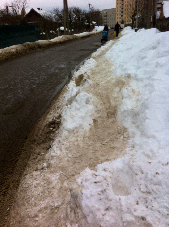 Тротуар по улице Горького. Фото было размещено в социальных сетях. Мамочки с колясками вынуждены передвигаться по проезжей части дороги. Очисткой тротуаров от снега никто не занимается. Даже в центре, рядом с администрацией, тротуары привели в более-менее нормальное состояние совсем недавно. |