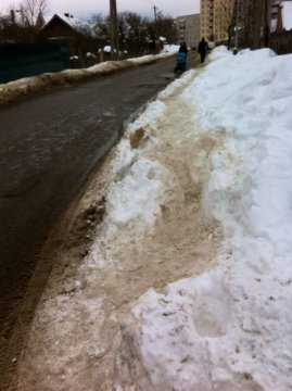 Тротуар по улице Горького. Фото было размещено в социальных сетях. Мамочки с колясками вынуждены передвигаться по проезжей части дороги. Очисткой тротуаров от снега никто не занимается. Даже в центре, рядом с администрацией, тротуары привели в более-менее нормальное состояние совсем недавно.