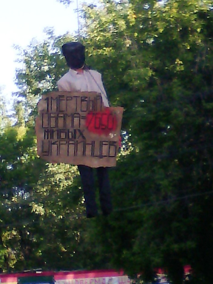В ПЕРМИ НЕИЗВЕСТНЫЕ ПОВЕСИЛИ ЧУЧЕЛО БАРАКА ОБАМЫ НА МОСТУ. В Перми неизвестные повесили чучело Барака Обамы на мосту недалеко от местного вуза. Манекен, одеты в брюки и белую рубашку, с наброшенным на голову черным мешком висел на веревке прямо под мостом над проезжей частью. На груди у чучела виднелась табличка, которая гласила, что это действующий президент США Барак Обама, сообщили в местном управлении МВД. Фотографии куклы появились в соцсетях. Заметившие чучело пермяки сообщили о нем в полицию, в итоге провокационную куклу сняли. И сейчас сотрудники выясняют все обстоятельства инцидента и разыскивают тех, кто это сделал. После проверки будет решаться вопрос о возбуждении уголовного или административного дела. Чучело Обамы в российских городах появляется не первый раз. В феврале этого года жители поселка имени Александра Космодемьянского в Калининграде сожгли такую куклу во время празднования Масленицы. Фото из группы «В контакте» «Пермь Активная» коментарий из статьи: vasyak: "Низкая пенсия? Задолбал алкоголизм? Дырявые дороги? Сожги себе немножко Обамы и всё сразу станет хорошо." nevski153: " Только насквозь прозомбированный народ может спрашивать с чужого, а не со своего правителя." источник статьи: http://echo.msk.ru/blog/echomsk/1588088-echo/ |