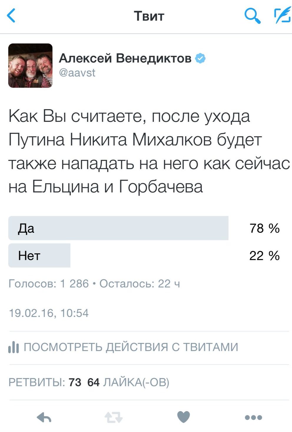 MAKLAY, Вы же знаете, придворные баре всегда прислуживают, а потом предают своих владык. navalny.com/p/4733/ : Никита Михалков 2016: Преступления Ельцина должны быть признаны на государственном уровне. Он развалил страну. Никита Михалков 1996: Поддерживаю Бориса Николаевича Ельцина на президентских выборах, ему нет альтернативы. Он спас страну от катастрофы. В связи с этим открытое обращение к Никите Михалкову: Дорогой Никита Сергеевич Михалков! Такой хернёй даже Сергей Сергеевич Паратов заниматься бы не стал. Стыдно. https://twitter.com/aavst Девиз семейства: "Предаем всех" Да и Голосование на эту тему уже давно закончилось... источник: https://twitter.com/aavst |