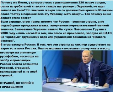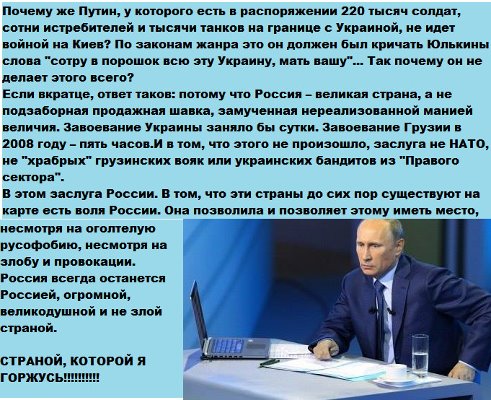 Важна реакция интернет-украинской общественности на эту трагедию (про реакцию россиянских либерастов даже и писать не стоит): "хорошо горит вата", "колорады огребли", "патриоты победили", "люблю шашлык". Ради проформы я поставил химически чистый эксперимент "собаки Павлова", пНЕ редположив несложный ход мысли "украинцев": 1. Сожгли российских диверсантов, наймитов ФСБ и Путина. 2. Так им и надо, пусть сдохнут "колорады". 3. Проклятые "колорады" сожгли себя сами. Все это и в такой же последовательности и с такими же подробностями сначала у меня в комментариях воспроизвел кошерный украинец yoserian (борец с "ватой" и Путиным из Днепропетровска) - 15 граждан РФ и 5 граждан Приднестровья, а сам вброс сделали укро-СМИ, в частности, ТСН. Это ведь только путинская пропаганда лжет, а разве может лгать укро-СМИ? При том, что уже вечером 2 мая было понятно, что погибли как раз не заброшенные диверсанты, а самые что ни на есть коренные одесситы. Затем это было подтверждено и МВД Украины. Думаете, это как-то подействовало на укров? Они стали извиняться, они стали писать опровержения собственной лжи? Н-*-*-У-Я. Полет в мусорпроводе ублюдки продолжили распространением в Интернете фейковых фото якобы российских паспортов сгоревших людей. И, естественно, продолжили безумно радоваться убийству своих же сограждан - граждан Украины, жителей Одессы. В конце-концов, погибших признали самоубийцами - мол, сами себя сожгли. И продолжили праздновать "перемогу". Для большинства российских пользователей это, конечно, стало неприятной правдой о том, кто такие "украинцы", и в каком мире вообще существует РФ. До этого у нас были распространены разговоры о тупом "руське быдле", "ватниках" и так далее. Действительно, русские - не самый, наверное, лучший народ на земле (немцы гораздо лучше, хотя они и сожгли 6 миллионов евреев, так считается официально). Но вот украинские психопаты побили все рекорды, упали ниже любого морального дна. И главное - они всерьез считают это перемогой, победой, успехом. Как думаете, почему? Только потому, что они дегенераты и тупые? Мало кто из россиян понимает, что на Украине все последние 23 года и далее шла, идет и будет идти разнузданная военная пропаганда против русских. Не против Путина, а именно против русских и России. Не важно, будет ли ее возглавлять Валерия Ильинична Новодворская или американо-украинский шпион Навальный. Все равно будет идти. Что такое военная пропаганда? Это не совсем пропаганда преимуществ войны над мирной жизнью, как может показаться. Дело все в том, что заставить одних людей с легкостью убивать других, да еще и гордиться этим - дьявольски непростое дело. Для этого нужно: 1. Втемяшить в голову людей, что их будущие "враги" лишены всех человеческих свойств. 2. Если будущий "враг" - родственный народ, или даже тот же народ, то надо лишить его идентификационных свойств. Одно дело убивать "брата", а другое - непонятного "зваргускорла" с пятью ногами и жвалами как у космических насекомых. 3. При этом будущий "враг" обладает впечатляющим списком обид и несправедливостей, нанесенных обрабатываемому пациенту. То есть, есть и первопричина убийства - ответка за все "радости жизни". 350 лет русские издевались над украинцами, пришла пора дать отпор. Все это в той или иной последовательности каждый день льется с телевизоров, с радио, исходит из газет и электронны