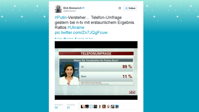 Европейское ТВ шокировано результатами опроса, проведенного в Германии - во время Дня Победы, популярный немецкий телеканал N-TV решил провести голосование в прямом эфире, итогом которого стали 89% ответов "да" на вопрос "Проявляете ли вы понимание к курсу Путина?". Представители телеканала уже заявили, что недоумевают над неожиданными результатами опроса, который должен был показать многотысячное "нет". Об этом, в частности, заявила и телеведущая Ромми Арндт, и корреспондент Дирк Эммерих Возможно, это спонтанная флюктуация и "добрая воля" немцев, 9 мая вспомнивших о зверствах фашистов - как своих предков, так и "новорощенных" на Украине"? Нет. Почему? Не бывает столь частых повторений "странных результатов" - а в последнее время в ЕС и США огромное количество граждан начинают поддерживать политику РФ, причем как внешнюю, так и "традиционализм и консерватизм" - о чем пишут ведущие мировые эксперты и СМИ. Что же, напомним по порядку. Начнем с того, что в США, (не)истово критикующих Россию, эксперты Quinnipiac University провели социологическое исследование и узнали - что бы не говорил госдепартамент, но "американцы не считают Путина похожим на Гитлера". При этом ведущие социологические службы США констатируют рекордное падение рейтинга Барака Обамы и взлет заявлений о том, что "Америка идет не туда". Но это - не все. Даже известный своей...скажем так, ангажированностью телеканал Fox News сообщил, что подавляющее большинство американцев считает Барака Обаму лгуном. При этом больше 1/3 респондентов уверены, что глава Белого дома лжёт не изредка, а "большую часть времени". Дальше - больше. Немецкий "гранд" Infratest dimap провел общегосударственный опрос, который показал - хоть Меркель и пытается продавить конъюктурные решения о санкциях (против чего протестуют ведущие мировые корпорации, в том числе - немецкие), но половина (!) немцев "критикует санкции в отношении России и считает Германию мостом между РФ и Западом". Западные СМИ шокированы массовой поддержкой России и Путина в Европе Аналогичные данные получил и крупнейшее мировое издание Wall Street Journal - поданным его опроса, высокообразованные европейцы сказали "баста" критике и санкциям в отношении РФ. Британский же телеканал Citezen.TV с удивлением узнал в результате массовых интервью, что жители Великобритании "считают образ России излишне демонизированным британскими и мировыми СМИ" и упрекают западную прессу в том, что "при освещении событий в Украине и предоставляют одностороннюю информацию о происходящем". Уверены, что вряд ли кто-то не знает, что представляет свобой всемирно известное СМИ - газета The Independent. Так вот, опросив своих читателей "кто является мировым фаворитом", издание было шокировано результатом - около 90% заявитло, что это Владимир Путин. Барак Обама и Ангела Меркель смогли набрать лишь 2% и 4% голосов. На днях, кстати, The Independent выстрелил еще более сенсационным материалом - написав, что политика Путина и России "не агрессия", а "забота о безопасности Черноморского флота в Севастополе, влияние в соседнем государстве и защите русскоязычного населения на Украине". Журналисты возмутились, что эти цели "постоянно неверно истолковываются или маскируются Западом". Да, это - тенденция. Не зря же исполнительный глава института Рона Пола Дэниэл Макадамс заявил, что находит "ошеломительным" лицемерие Америке по украин