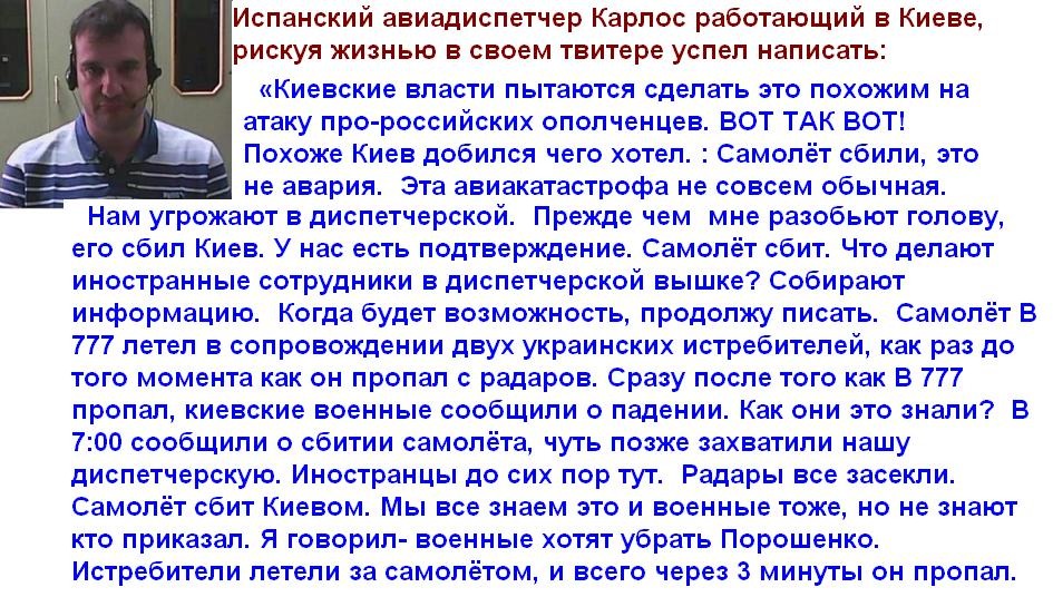 http://www.youtube.com/watch?v=tidJ7O1zKRk СООБЩЕНИЕ ОТ ДИСПЕТЧЕРА КАРЛОСА . Моё мнение,что самолёт подстава 100 процентов.под шумок могут многое натворить,мы будем виноваты Последний раз редактировалось Леля; 19.07.2014 в 00:13. |