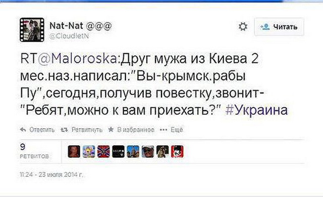 Ваши друзья скачут и кричат :"слава шакалам". что делали фашисты и что творили бандеровцы,я для Вас писала,читайте внимательно и смотрите. Одесса.Два госпиталя полностью забиты ранеными,выписывают,дают справку,что бытовая травма. Понаехало очень много нацистов и другого отребья,(неделю назад)Народ сметает всё с прилавков,цены растут.Начинается зачистка.Технику действительно доставили в Одессу,чью не знают и много. (много ушло в подполье,открыто не говорят.боятся) Последний раз редактировалось Леля; 24.07.2014 в 01:22. |