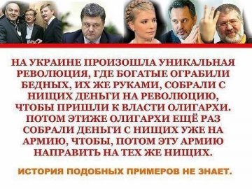 - В армии,как оказался? - Я доброволец! - Зачем? - Воевать с Россией! - Россия на вас напала? - Да! Они у нас Крым отняли! - А не жители ли Крыма сами не захотели жить в составе Украины? - Нет, их Россия силой присоединила!!! - Откуда знаешь? - Все говорят! - Кто? - Да все! - А на Донбасс зачем поехал воевать? - Я говорю же с Россией? - А на Донбассе разве есть российские войска? - Да!!! - А сам видел? - Нет, но все говорят,что есть! - Кто конкретно говорит? - Да, все говорят! - Ну и как повоевал? - Нас предали! - Кто? - И Киев и командование! - Значит виновные всё-таки в Киеве? - Нет. В Москве! - Почему? - Я же говорю,что Россия на нас напала!!!!!!!(истерика) - Ну а ты сам войска России на Украине видел? - Нет, но они где-то точно есть!... |