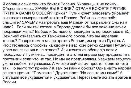 ![]() Источник вконтакте Да вконтактные дебилы ни строчки не написали за всю историю социалки!Источник http://news-front.info Новости лугандона. Прпагандонский сайт. Кстати локация Москва. А еще такой же текст у кремлебота в ЖЖ. Ну оно и правильно. Не кого там "защищать", а быть пушечным мясом глупо. Тем более сейчас. |