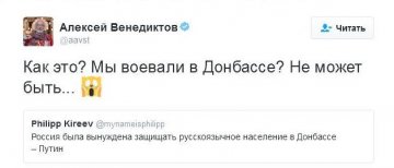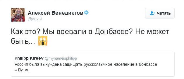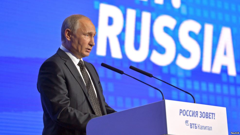 ПУТИН: "МЫ БЫЛИ ВЫНУЖДЕНЫ ЗАЩИЩАТЬ РУССКОЯЗЫЧНОЕ НАСЕЛЕНИЕ ДОНБАССА". Владимир Путин на форуме "Россия зовет!" Россия "была вынуждена защищать русскоязычное население в Донбассе", заявил президент Владимир Путин во время своего выступления на инвестиционном форуме "Россия зовет!" в Москве. Так глава государства прокомментировал ухудшение российско-американских отношений, которое, по его мнению, началось после революции на Украине. Путин заявил, что события зимой 2014 года в Киеве были спровоцированы Соединенными Штатами, и именно из-за государственного переворота на Украине Кремль "был вынужден" поддержать сепаратистов в Донбассе, а также "отреагировать на стремление людей, живущих в Крыму, вернуться в состав России". Крым был аннексирован весной 2014 года после "революции достоинства" на Украине. Путин отрицал военное вмешательство России в дела полуострова, однако позднее заявил, что российские военнослужащие "помогали людям выразить свое мнение" на референдуме по вопросу о присоединении к России. Помимо незаконной аннексии Крыма, Киев и международное сообщество обвиняют Кремль в вооруженной поддержке сепаратистов в Донбассе. Путин ранее заявлял, что армия России ни в какой форме не участвует в конфликте на Украине. Однако, по данным Киева, в Донбассе в разное время находились до восьми тысяч кадровых российских военнослужащих. За аннексию Крыма и поддержку сепаратистов Украина и страны Запада ввели в отношении России экономические санкции. источник: http://www.svoboda.org/a/28048368.html РОССИЯ БЫЛА ВЫНУЖДЕНА ЗАЩИЩАТЬ РУССКОЯЗЫЧНОЕ НАСЕЛЕНИЕ В ДОНБАССЕ. Об этом сегодня на форуме «Россия зовет» сказал президент Владимир Путин. Он также добавил, что Москва была вынуждена отреагировать на стремление людей, живущих в Крыму, вернуться в состав России. В ответ на это, заметил российский лидер, начали раскручивать новый маховик политики против России и введения санкций. Он также заверил, что российская сторона не саботирует исполнение минских соглашений. источник: http://echo.msk.ru/news/1854628-echo.html источник: https://twitter.com/aavst |