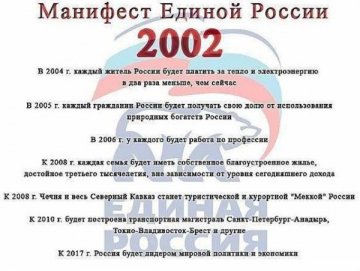 Только теперь - уже почти единогласно!.. Больше лжи, больше русских ценностей! Только сначала вспоминается закомплексованный лозунг "Догоним и перегоним Америку!" Потом вспоминается хрущёвская "Программа построения коммунизма", рассчитанная до 1980 года. Ожидалось, что к этому сроку все граждане страны будут бесплатно пользоваться общественным транспортом, получат отдельные благоустроенные квартиры и научно обоснованное количество основных продуктов питания на душу населения. Но в этом проекте манифеста Единой России - всё круче - за 15 лет - мы - лидеры мировой политики и экономики! "Они обманули ВСЕ ожидания народа и не выполнили НИ ОДНОГО обещания. Удалив предвыборную программу тех лет со своего сайта, они фактически еще раз расписались в своей жуликоватой сущности." Но народ ещё больше сплотился вокруг любимой партии, и как святыню принимает каждую букву от любимых чиновников! Ура! Мы победили! Мы лидеры! источники статей, подробнее: http://www.ng.ru/politics/2002-12-23/1_bear.html http://ar4es.info/13384 Последний раз редактировалось Иванов; 03.08.2015 в 03:14. |