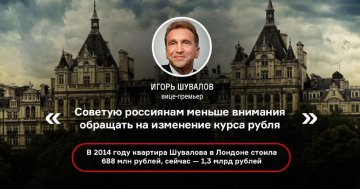 НОВЫЕ ВОЗМОЖНОСТИ: ЛОНДОНСКАЯ КВАРТИРА ВИЦЕ-ПРЕМЬЕРА ШУВАЛОВА ПОДОРОЖАЛА НА ПОЛМИЛЛИАРДА РУБЛЕЙ. Первый вице-премьер российского правительства Игорь Шувалов посоветовал россиянам меньше внимания обращать на изменение курса рубля. Об этом он заявил, отвечая на вопрос журналиста агентства RNS о необходимости возобновления валютных интервенций Центробанка. http://radiovesti.ru/article/s… Отличный совет от вице-премьера, получающего огромное удовольствие и огромные же прибыли от изменения курса рубля. Только лондонская квартира Шувалова, расположенная в ленегдарном здании Whitehall Court, площадью 500 (пятьсот) квадратных метров подорожала в рублях на 603 миллиона. В 2014-м, когда Шувалов её приобрел по цене 11,5 млн фунтов, рублёвая цена составляла 688 миллионов рублей, а сегодня это 1 миллиард 290 миллионов рублей. Наверное, именно это и имел в виду сегодня Владимир Путин, сказавший, что обвал рубля открывает новые возможности. http://echo.msk.ru/blog/corruption/1697822-echo/ |