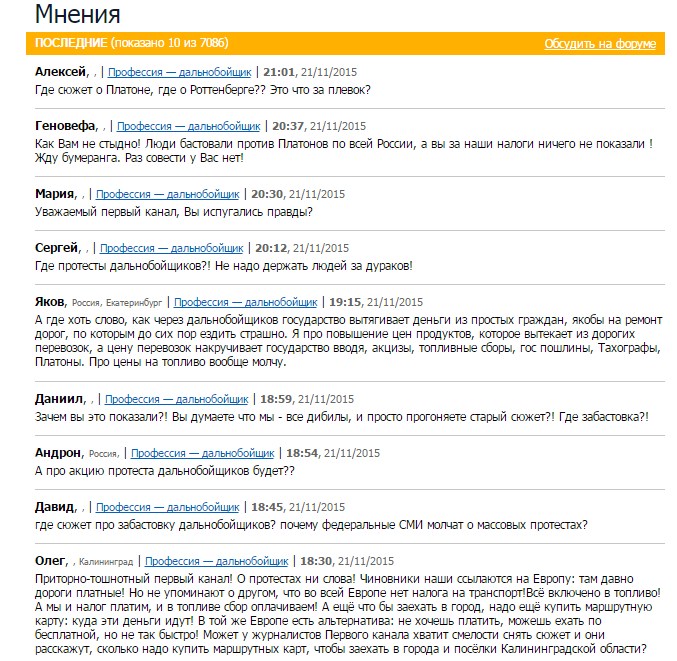 ВСЁ ЧТО ВАМ НАДО ЗНАТЬ ПРО ПРОТЕСТЫ ДАЛЬНОБОЙЩИКОВ. На прошлой неделе власти попытались ввести новый сбор с водителей большегрузов, это спровоцировало массовые протесты по всей стране. Я собрал всю информацию и постарался разобраться в ситуации. ЧТО СЛУЧИЛОСЬ? Еще в апреле 2011 года Госдума приняла федеральный закон, по которому водители большегрузов (весом больше 12 тонн) должны платить новый сбор. Мотивировали его тем, что фуры наносят сильный ущерб федеральным трассам. Этот ущерб должен рассчитываться и оплачиваться через систему «Платон». Ее запуск состоялся 15 ноября и она вызвала шквал критики от дальнобойщиков и предпринимателей. КАК РАБОТАЕТ «ПЛАТОН»? «Платон» — это система, которая отслеживает путь дальнобойщика и взимает с него плату по установленному тарифу. Сначала нужно зарегистрироваться в системе: зайти на сайт, отправить на указанную электронную почту сканы необходимых документов (ИНН, свидетельство о регистрации индивидуального предпринимателя, техпаспорт на машину, обычный паспорт) и ждать ответа в течение трех-пяти дней. Кроме того, необходимо обзавестись расчетным счетом в банке. После этого можно оплачивать через него свои поездки. Есть два способа оплаты: — с помощью установленного в автомобиле трекера. Через спутник ГЛОНАСС он отслеживает координаты машины, рассчитывает плату за пройденный путь и автоматически списывает деньги со счета; — с помощью маршрутной карты. Это документ на разовую поездку, в котором указан адрес отправления и прибытия, время и маршрут. Чтобы получить его, нужно оформить поездку на сайте «Платона» или через мобильное приложение и оплатить ее. Контролировать дальнобойщиков планируют с помощью стационарных пунктов видеофиксации и видеокамерами на колесах. СКОЛЬКО НУЖНО ПЛАТИТЬ? Сейчас стоимость проезда по федеральным дорогам для большегрузов составляет 1,53 рубля за 1 км пути. С 1 марта 2016 года тариф будет составлять 3,06 рубля за 1 км пути. Предусмотрена и система штрафов в случае неоплаченного проезда: индивидуальный предприниматель заплатит 40 тыс. рублей, а компания — 450 тыс. рублей. В случае рецидива штраф для ИП — 50 тыс. рублей и для ООО — 1 млн руб. Сообщалось, что первые полгода работы системы штрафы будут взиматься только в Подмосковье. В 2016 году планируется собрать с большегрузов 40 млрд рублей — эта статья доходов заложена в бюджете будущего года. Деньги будут инвестированы в дорожное хозяйство страны. КТО ЗАНИМАЕТСЯ СБОРОМ ДЕНЕГ? Разработчик системы взимания платы с фур должен был определиться в результате конкурса. У российских компаний опыта создания подобных программ нет, поэтому в конкурсе участвовали иностранные компании. Но «Ростех» написал письмо Путину с просьбой отменить конкурс из соображений госбезопасности и передать проект ему. В результате разработкой системы и сборами занимается частная компания «РТ-Инвест Транспортные системы» (на 50% она принадлежит сыну Аркадия Ротенберга Игорю, еще на 50% — бизнесмену Андрею Шипелову и структурам «Ростеха»). Дальнобойщики прозвали взимаемую «Платоном» плату «сбором Ротенберга». ЧТО НЕ НРАВИТСЯ ДАЛЬНОБОЙЩИКАМ И ПРЕДПРИНИМАТЕЛЯМ? Много чего. В целом система выглядит сырой, непродуманной и несправедливой. Давайте по пунктам. 1. Дальнобойщиков возмутил сам факт запуска этой системы. Они не понимают, почему они до