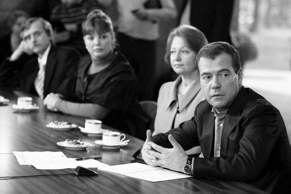 В моём коллективе около 100 человек от 3 до 22 лет. Основной репертуар составляют народные танцы и танцы народов мира, большую часть, конечно, русский танец. Я сама выросла в подобном коллективе. Стараюсь своим детям прививать любовь к своей родине через обряды, через танцы. И, конечно, очень волнует вопрос поддержания нашей национальной культуры. Очень волнует этот вопрос! Мы со своей стороны её популяризируем. Нас очень любят в городе, любят в районе. Мы выступаем на международных уровнях. Но нам не хватает транспорта, нам не на чем выехать, костюмов. Сейчас, например, за бюджетные средства я могу поставить один номер, полностью его одеть и обуть. Один за год! А хочется показывать программу. У меня в репертуаре 40 номеров. А за год могу сделать один. Хочется, чтобы и наши программы были, и программы других коллективов. У нас хороший театральный коллектив, вокальный, цирковой, ещё помимо моего четыре танцевальных коллектива. Очень хочется, чтобы на нашей сцене мы выглядели достойно. У нас практически нет световой аппаратуры, аппаратура 60–70-х годов – сцена «слепая», как говорят специалисты. И хочется звуковой аппаратуры. И ещё небольшая реплика. В средствах массовой информации сейчас очень мало внимания уделяется именно русской культуре, традиционной культуре. Мы сохраняем её внутри, мы несём это детям. Как дерево без корней, когда почва уходит, оно не может расти, оно погибает. Так и русский народ. Он должен знать свои истоки, знать своих предков. Поэтому это нужно сохранять, это нужно поддерживать. И мы готовы помогать Вам в этом. Д.А. Медведев: Спасибо большое, Алёна Леонидовна. В отношении того, что нам надо сохранять наши истоки. Я думаю, что тоже не открою Вам Америки, если скажу, что это в значительной мере зависит от самих нас. Конечно, должна быть общая установка государства на то, чтобы поддерживать не только совсем современные виды искусства, это тоже хорошо на самом деле, а чтобы было многообразие. В то же время Вы говорите, что этому совсем не уделяют внимания, допустим, в различного рода средствах массовой информации. Я всё-таки, наверное, с этим не соглашусь. Вопрос в том, кто что ищет. Если человек ищет только попсу какую-нибудь, его же не заставить, знаете, включить и слушать русскую народную музыку или классическую музыку. Мы с 15-го года практически во всех наших регионах перейдём на цифровое вещание. Сначала будет один пакет из десяти каналов, потом будет (буквально через год) 20 каналов. Я считаю, что в рамках, допустим, этого цифрового пакета так называемого обязательно должен быть какой-то канал, который прививает музыкальную культуру, классическую культуру пропагандирует, культуру народов нашей страны. На это можно планировать деньги даже. Насчёт аппаратуры – будем тоже думать, что с этим делать. Хорошо, коллеги, есть ещё что-то такое, что не звучало и что носит общероссийский характер, а не локальный? Г.Ф. Симакина, заместитель директора Государственного историко-культурного и природного музея-заповедника имени Александра Сергеевича Грибоедова «Хмелита»: В состав заповедника входит несколько усадеб, связанных с жизнью Александра Сергеевича Грибоедова. Также место рождения адмирала Павла Степановича Нахимова входит в состав музея-заповедника. Поэтому у нас два музея. В 2009 году реализовано решение оргкомитета «Победа» и откр