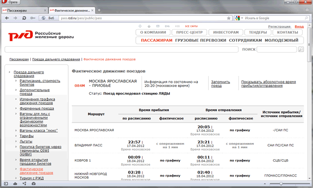 Компания "Российские железные дороги" (РЖД) сообщила о вводе в эксплуатацию онлайнового инструментария, позволяющего в режиме реального времени отслеживать движение пассажирских поездов дальнего следования, курсирующих по территории РФ, в сообщении со странами СНГ и Балтии. Для того чтобы воспользоваться новым сервисом, необходимо проследовать на сайт pass.rzd.ru, выбрать вкладку "Движение поездов онлайн", указать станцию отправления и прибытия интересующего поезда, дату отправления или прибытия и нажать кнопку "Найти". Если состав находится в пути, то система покажет, какую именно станцию только что проследовал поезд. Если таковой уже прибыл на интересующий вокзал или станцию, то сервис выдаст информацию "Поезд прибыл". При переходе по ссылкам "Поезд проследовал станцию..." или "Поезд прибыл" пассажир может просмотреть подробные сведения о движении оного по маршруту. Если указать только станцию отправления или прибытия и дату, то сервис покажет фактическое движение поездов по данной станции или вокзалу: статусы поездов (прибыл или отправился), время отправления и прибытия и т.д. ![]() Сведения о фактическом движении железнодорожных составов заимствуются из разных источников. Для сбора информации используются: СЦБ - устройство сигнализации, централизации, блокировки (погрешность до 2 минут), САИ ПС - система автоматической идентификации подвижного состава (погрешность до 5 минут), ГЛОНАСС - глобальная навигационная спутниковая система и АСОУП - автоматизированная система оперативного управления перевозками. Ранее, напомним, РЖД отрапортовала об успешном проведении испытаний сервиса по предоставлению услуг широкополосного доступа к ресурсам глобальной сети, телевидению, сотовой связи в поездах дальнего следования. Старт пилотного проекта по реализации данных услуг намечен на конец 2012 года. ссылка сам еще не тестеривал, пока никуда не еду