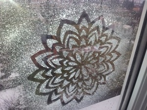 Знаете как? Вырезанные бумажные снежинки увлажняете и наклеиваете на зеркала (у нас в прихожей зеркальный шкаф большой, где зеркала от потолка до пола). Снежинки не должны долго держаться, поэтому обрабатывать их надо довольно быстро. Когда они высохнут, то слетят с поверхности. Далее разводите зубную пасту в воде до насыщенного белого цвета. И пульверизатором распрыскиваете этот раствор на снежинку. Когда все просохнет, снежинка сама улетит на пол, а на зеркале останется красивый узор. Пример прикладываю... нашла в инете. Только здесь окошко, а не зеркало.