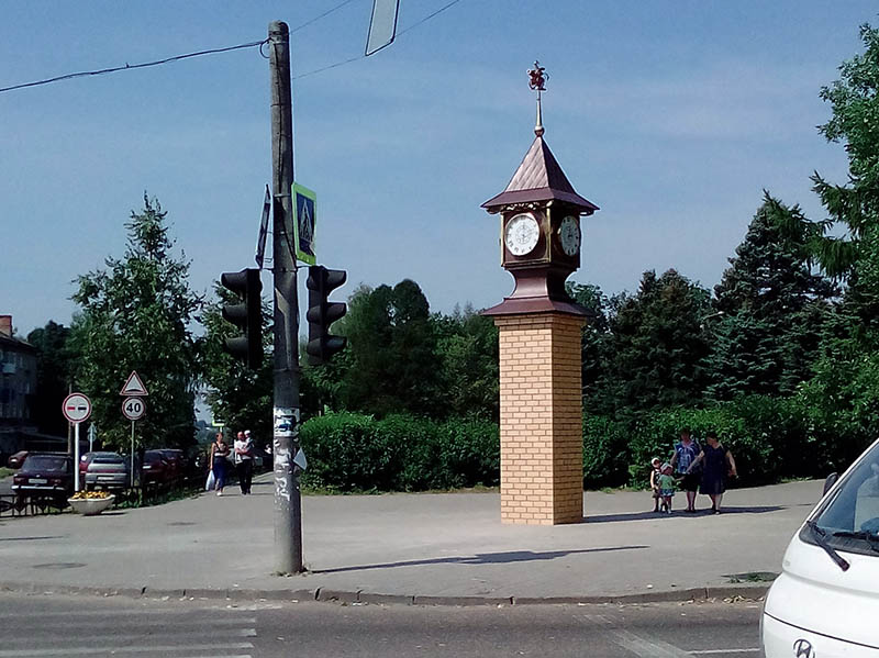 Конечно низковат постамент ещё бы пару метров вверх, даже на фоне светофорного столба смотрится как недоросток. Ну и фантазии не хватило более, чем на кирпичную кладку (как труба от печи). Циферблат нужно больше и обязательно контрастные стрелки, эти сливаются с фоном. При солнце бликует, даже вблизи не сразу разберёшь, вдалеке тем более. Вверху так и не понял, что за вензель, мне кажется поставь туда флюгер хотя бы прок был, знали бы откуда ветер дует... В общем я расстроен. Хорошая идея и некудышнее исполнение. |