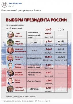 Началось с того, что на многих участках, открывшихся в 8.00, в урнах уже лежало много бюллетеней. Объясняли так: это проголосовали полиция и члены ИУ. Вопрос: проголосовали до открытия? ![]() Далее началось - вбросы, массовые организованные голосования студентов и армии, закрытие видеокамер, изгнание наблюдателей. Трансляция и хроника событий подробно здесь: https://echo.msk.ru/blog/echomsk/2167588-echo/ Видео называется: Вбросы, вбросы, Путин, вбросы. Вброс бюллетеней в селе Бобково Рубцовского района на выборах 18 марта 2018 г-2: Великий Новгород. Женский монастырь. Нарушение тайны голосования: голосуют под наблюдением руководства. Потом пошли результаты. "Эхо Москвы" публиковало официальные данные ЦИК. Первые данные с 20% обработанных бюллетеней показывает, что у Путина аж 72,08, у Грудинина 15,80. Но этого показалось мало, и понеслось: Как такое может быть, что по мере подсчёта голосов проценты шли только на прибавку Путину и отнятие от Грудинина?.. Добавлено через 3 минуты 12 секунд Вброс в Чечне. село Илсхан-Юрт, УИК 137. Добавлено через 2 минуты 58 секунд Вбросы в разных регионах. Как так можно? Добавлено через 14 минут 46 секунд Вбросы в Махачкале. |