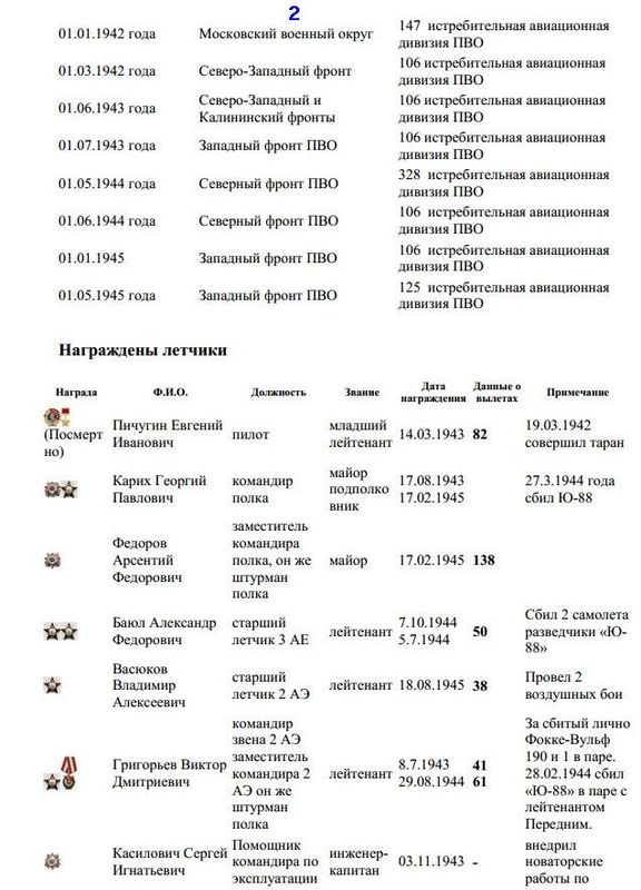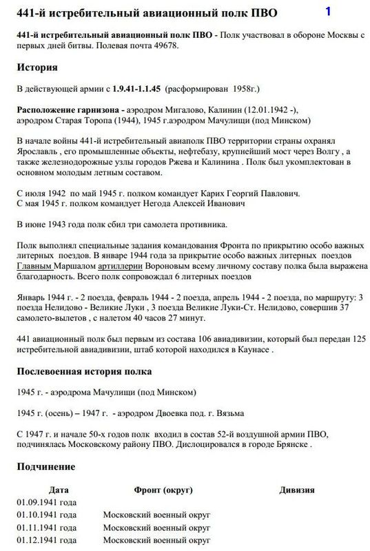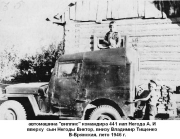 Воспоминания Владимира Тищенко, сына летчика 441 ИАП. В 1945 г. в мае месяце командир полка Карих Георгий Павлович был переведен в другой полк, а полк часто менял дислокацию и весной 1946 г. с аэродрома Мачулищи (под Минском) перелетел на аэродром Двоевка. Мы с мамой только весной 1946 года приехали к отцу. Авиаполк, в котором служил мой отец дислоцировался на аэродроме возле села Двоевка под Вязьмой. В пос. В-Брянская все дома , железнодорожная станция и аэродром были сильно разрушены, всюду были остовы сгоревшей техники и сбитых самолётов, а земля там была нафарширована железом так,что нас, детей старались не выпускать из дому. Один наш транспортный самолет, ребята называли его "Дуглас" лежал в поле недалеко от дома, порядком раскуроченный, но моторы и некоторые бронестекла еще сохранились, а колеса утопали в земле. Левая сторона самолета была сильно пробита, вероятно пулями и в нем мы - дети любили играть. Я сам, семилетний, как-то притащил домой неразорвавшуюся мину, за что естественно получил нагоняй. А лимонками мы играли в войну в развалинах дома который находился от нас через дорогу, спуская их с выдернутой чекой по наклонной стене. От тех детских "игр" до сих пор сохранился шрам на левой руке.Там ведь шли страшные бои и потом,когда немцев уже гнали от Столицы. Ближе к аэродрому находилось большое стрельбище с земляным валом и обшитое толстыми металлическими листами с заметными шербинами от пуль или снарядов. На аэродром нам одним запрещали ходить, я был на нем раза три весной-летом с отцом ,но к самолетам не подходил, там стояла охрана. Путь на аэродром проходили по тропинке в березняке и там собирали грибы, которые потом дома жарили. Командный состав был размещен в единственном уцелевшем двухэтажном доме, а техсостав и БАО на постое в частных домах деревнях Двоевка и Певное и землянках у дер. Двоевка. Дом в котором жили двухэтажный с двумя подьездами( он и сейчас сохранился, его фото мне прислали), наша комната была угловая на втором этаже во втором подьезде, окнами на юг. В доме были кирпичные печи и даже электричество, что после землянок под Минском казалось раем. Помню сослуживцев отца Ташхаджаева, Григорьева и других, их разговоры о полетах и о том что "Аэрокобры" сильно отличаються от привычных им Ла-5 при взлете и посадке. Помню тот эмоциональный подъём царивший среди них(ведь недавно была ПОБЕДА).Отец закончил ВОЙНУ комэском и ребята его эскадрильи были у нас постоянными гостями, почти все имели сбитые самолеты и военные награды. Помню фамилию командира полка - Негода (запомнил потому, что сын его Виктор мой ровесник) и у него был единственный в гарнизоне легковой автомобиль "Виллис", порядком подразбитый и обшитый железом. Часто мы с сыном Негоды лазили по нему. Даже фото с ним сохранилось. Школа была устроена в большом бараке рядом с железной дорогой. В школу ходили через желдорогу, через рельсы был устроен деревянный настил. В школе было два класса, в нашем классе учились ребята 7 - 10 лет, в другом чуть постарше, девочек в школе не было. В классе было три ряда столов с стульями, классная доска на стене и бачок с водой у входа, учеников в нашем классе было человек 25. По пути из школы рядом с дорогой стоял сгоревшая автомашина, типа Виллис или наш Газ, на нем сохранились руль и каркас сиденье и мы играли в на нем в шоферов. Так мы прожили в Двое