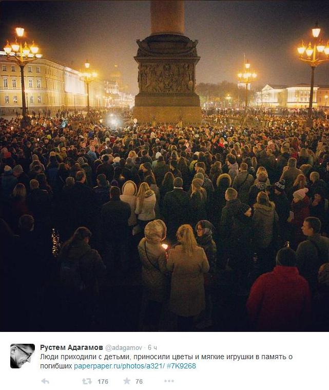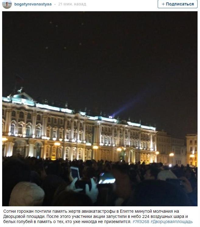 Т.е. при аварии - разделение салона самолёта на несколько капсул с несколькими большими парашютами? Как спускаемый аппарат космического корабля. Действительно - это стоило бы разработать! Умная мысль, и наверняка - не так уж дорога в исполнении. Видится очень нужной и спасительной. Наверное, гениальный Королёв мог бы разработать что-то подобное. Добавлено через 40 минут 19 секунд СОТНИ ЛЮДЕЙ СОБРАЛИСЬ НА ДВОРЦОВОЙ ПЛОЩАДИ ПЕТЕРБУРГА, ЧТОБ ПОЧТИТЬ ПАМЯТЬ ПОГИБШИХ В РЕЗУЛЬТАТЕ КРУШЕНИЯ САМОЛЁТА. Сотни людей собрались в центре Петербурга на Дворцовой площади, чтобы почтить память жертв погибших в результате крушения пассажирского самолета в Египте. Из более, чем 200 человек на его борту свыше 130 были жителями северной столицы России. Участники зажгли свечи и лампады. В небо были выпущены 224 воздушных шара. Добавлено через 2 минуты 37 секунд подробнее: http://echo.msk.ru/blog/echomsk/1650806-echo/ Добавлено через 5 минут 5 секунд коментарии: askanla: (вчера) "Какой-то невообразимый трэш в сети, в СМИ и особенно на ТВ по поводу авиакатастрофы. В прямом эфире министр транспорта!! Соколов впаривает, что связь с самолетом есть, а в это время там же бегущей строкой "президент Путин выразил соболезнования родственникам погибших". Идиотический телеканал "Звезда" впаривает, что катастрофы не было, а в это же время федеральные СМИ информируют об объявленном завтра трауре. Театр абсурда. И собственно вполне предсказуемый - в стране не осталось работающих государственных институтов и профессионалов. Нигде, ни в одной отрасли. Необразованность, мракобесие, животная жадность, агрессия, холуйство и как следствие абсолютная уже некомпетентность в обществе и соответственно в государстве превысили критическую массу. Все разворовано, разрушено, сломано. И вот результат. А в сети в это время кремлеботы с московскими и питерскими айпи изображают из себя "радующихся смерти мирных российских граждан украинцев". Их на самом деле немного, но у этих ублюдков по десятку аккаунтов и строчить свои говнопосты они могут безудержно. Вот такая картина на фоне трагедии. Чувство стыда и брезгливости зашкаливает." singal: "В стране, где защищена только власть, страшно быть летчиком, врачом, военным, учителем........Страшно быть! " nl_2010_: "Странно, что народ не повязали на Дворцовой. Разрешение на выход людей небыло. " askanla: "nl_2010_: ---побоялись, но ищеек-чекистов видно хватало - подслушивали: вдруг кто крамольное против власти начнет распространять. " ПРЕЗИДЕНТ ЕГИПТА АБДЕЛЬ ФАТТАХ АС-СИСИ ВЫРАЗИЛ ГЛУБОКИЕ СОБОЛЕЗНОВАНИЯ РОССИЙСКОМУ НАРОДУ, и комментируя ситуацию вокург катастрофы российского авиалайнера, заявил, что расследование причин крушения А321 может занять месяцы... А ГДЕ ЖЕ ПУТИН?????? ПОЧЕМУ ЕГО НИ КОГДА НЕТ В ТАКИХ ТРАГИЧНЫХ СЛУЧАЯХ????? Добавлено через 36 минут 47 секунд . корреспондент Алексей Нарышкин: ГДЕ ПУТИН? " Где Путин? Сегодня я его жду как никогда. Не пресс-релиза от Кремля, а настоящего, простите, президента. Щелкни просто пальцем — к тебе домой приедет все это госТВ. Скажи, что произошло с самолётом? Да, следствие идёт, виновных установит суд. Но не сейчас. Не надо поручений. Туфта это все. Выйди и объяви (соври): граждане, не бойтесь. Все под контролем! Если самолёт сам упал, вырази соболезнования и пообещай, что такого с нашим, мать его, импортозамещением, ватничеством, и 90% рейтингом больше никогда не по