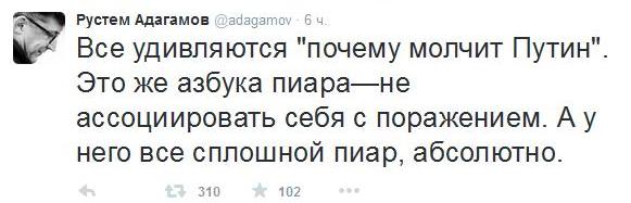 Добавлено через 50 минут 17 секунд Порошенко ограничился соболезнованиями в Twitter по случаю авиакатастрофы в Египте | Русская весна Президент Украины Петр Порошенко выразил свои соболезнования в связи с крушением в Египте российского авиалайнера. В отличие, к примеру, от президентов Франции, Латвии и глав некоторых других государств, он не направил официальную телеграмму, а ограничился сообщением в «Твиттере». — Выражаю соболезнования всем семьям погибших в катастрофе российского пассажирского самолета в Египте, — говорится в микроблоге Порошенко. Видимо чуть не подавился этими словами, а скорей всего не сам писал. |