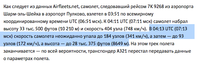 Как возможно такое быстрое падение скорости с 748 км/ч до 172 км/ч? (может вектор скорости был уже направлен вниз, и датчики в кабине продолжали несколько секунд передавать сигналы в свободном падении?) Как объяснить - не успели сообщить, и даже нажать кнопку SOS? Как объяснить падение обломков на расстоянии в 20 км, как при взрыве? Почему "первой отвалилась хвостовая часть" (где хранится багаж)? Разве это похоже на технические неисправности? АМЕРИКАНСКИЙ СПУТНИК (работающий в инфракрасном диапазоне) ЗАФИКСИРОВАЛ ТЕПЛОВУЮ ВСПЫШКУ НА СИНАЕ В МОМЕНТ КАТАСТРОФЫ РОССИЙСКОГО А321. Это мог быть взрыв в топливных баках или детонация взрывного устройства, сообщает NBC News со ссылкой на источники. По их словам, теплового следа от ракеты не было. В свою очередь, разведывательно-аналитическая компания Stratfor в своем докладе назвала наиболее вероятной причиной крушения лайнера взрыв на борту. Ранее власти Египта сообщили, что основной версией считают техническую неисправность. Накануне вечером в Кремле предложили не спешить с выводами. источник: http://echo.msk.ru/news/1651542-echo.html |
