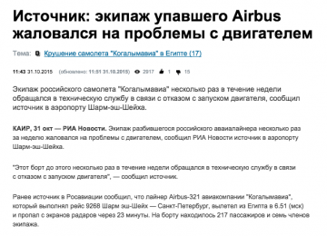 Египетские власти сообщили, что пропавший ранее с радаров российский пассажирский самолет, следовавший по маршруту из Шарм-эш-Шейха в Санкт-Петербург, потерпел крушение над Синайским полуостровом. Airbus А-321 принадлежит российской компании "Когалымавиа". На борту находились 224 человека - 217 пассажиров и семь членов экипажа, пишет Хроника.инфо со ссылкой на Русскую службу BBC. Египетские СМИ сообщают, что обломки самолета обнаружены в центральном районе Синайского полуострова. В "Росавиации" подтвердили потерю контакта с авиалайнером. "Сегодня в 6:51 из Шарм-эш-Шейха произвел вылет самолет А-321 рейс 9268 в Санкт-Петербург. В 7:14 под Ларнакой, по предварительным данным, с самолетом пропала связь и отметка воздушного судна исчезла с экранов радиолокаторов. С тех пор на связь оно не выходило, на радарах не появлялось", - заявил "Интерфаксу" представитель "Росавиации" Сергей Извольский. Информацию о крушении самолета подтверждает офис премьер-министра Египта Шерифа Исмаила, сообщает Рейтер. По его данным, крушение произошло в центральной части Синайского полуострова. СМИ сообщают, что египетский премьер взял под личный контроль расследование крушения российского авиалайнера и отменил все запланированные на сегодня мероприятия. Ранее поступала противоречивая информация о случившемся. Агентство Рейтер, первым сообщившее о пропаже самолета, позже сообщило со ссылкой на египетские авиационные власти, о том, что он покинул воздушное пространство страны без происшествий.http://hronika.info/mir/96346-v-egip...y-samolet.html Добавлено через 5 минут 58 секунд 31.10 - 12:47 Plane Finder: рядом с российским лайнером пролетали два самолета Рядом с Airbus A321 "Когалымавиа", который сегодня разбился в Египте, пролетали два других самолета приблизительно в то же время, когда с радаров исчез сам российский лайнер, сообщает портал Plane Finder, отслеживающий авиаперелеты в реальном времени. Египетские спасатели приступили к сбору тел на месте падения российского авиалайнера в центральной части Синайского полуострова, сообщает агентство Франс Пресс. 31.10 - 12:44 Египетские инженеры не досматривали упавший российский самолет перед вылетом Инженерные службы аэропорта Шарм-эш-Шейха не досматривали разбившийся российский самолет с 224 людьми на борту, передает РИА «Новости». На борту пропавшего в небе Египта самолета "Когалымавиа", выполнявшего рейс по маршруту Шарм-эш-шейх — Санкт-Петербург, находились клиенты туроператоров "Бриско" и "Одеон", сообщает радиостанция "Говорит Москва" со ссылкой на источник в консульстве РФ в Египте. Добавлено через 55 минут 40 секунд На месте крушения лайнера в Египте найдены четверо выживших, сообщает датское издание De Telegraaf. Всего на борту находились 224 человека, в том числе 17 детей и семеро членов экипажа. Ранее стало известно об обнаружении тел примерно ста погибших, в том числе пятерых детей. К месту крушения уже прибыл премьер-министр Египта Шериф Исмаил. Самолёт компании «Когалымавиа», выполнявший рейс Шарм-эль-Шейх — Санкт-Петербург, рухнул примерно через 25 минут после взлёта. Катастрофа произошла в 100 километрах от Эль-Ариша на севере Синайского полуострова. По факту крушения лайнера СКР возбудил уголовное дело, президент РФ Владимир Путин поручил сформировать госкомиссию, по поручению генерального прокурора Юрия Чайки генпрокуратура проведёт проверку. |