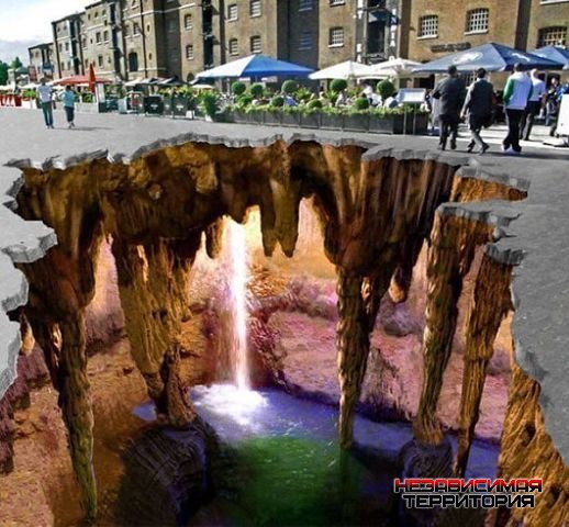 Всё больше в сети интернет появляется фоток с 3D псевдорисунками на асфальте. Откидывайте иллюзии на этот счёт, не все так просто нарисовать. В данном случае, контрастность наложенного на фото изображения, на порядок выше, чем глубина цвета дорожного покрытия, и это при солнечном свете.