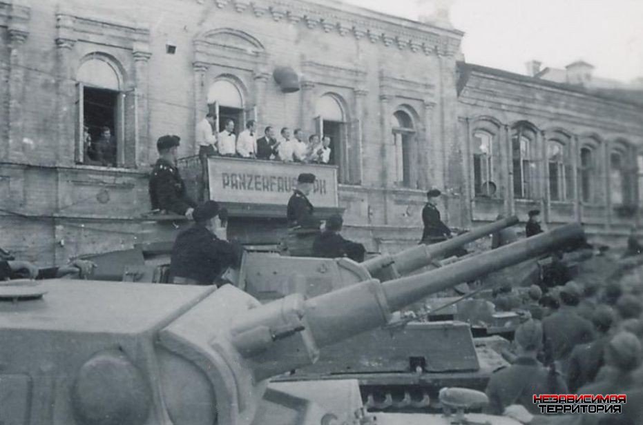 А кто силён в немецком? Что написано на транспаранте, что прикреплён к балкончику? Панцер - понятно, что танк, а дальше?