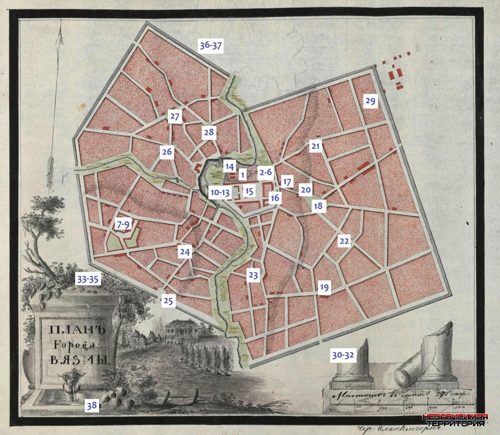 http://old-towns.ru/?page_id=3947 Добавлено через 7 минут 23 секунды из двадцати четырех храмов Вязьмы в ХХ веке полностью уничтожены четырнадцать, еще четыре лишились колоколен. Из одиннадцати часовен в сильно изуродованном виде дошла до наших дней одна. Что хуже всего – город полностью утратил свой «небостремительный» облик, растекся по горизонтали, распластался по холмам, практически лишился захватывающих дух панорам. О восстановлении разрушенного речи, похоже, не идет. Вязьма, сто лет назад вполне способная затмить красотой многие точки будущего «Золотого кольца», к началу XXI века вынуждена мириться с ролью «города единичных шедевров»… 1. Троицкий собор 2. Спасский собор Аркадьевского монастыря 3. Всехсвятская часовня Аркадьевского монастыря (уничтожена) 4. Спасская башня Аркадьевского монастыря (Вяземской крепости) 5. Ограда (уничтожена) с башенкой Аркадьевского монастыря 6. Святые ворота Аркадьевского монастыря 7. Одигитриевская церковь Предтеченского монастыря 8. Знаменская церковь Предтеченского монастыря (уничтожена) 9. Надвратная Вознесенская церковь Предтеченского монастыря, с настоятельскими кельями и оградой 10. Богородице-Рождественская церковь (уничтожена колокольня) 11. Часовня на Торговой площади (уничтожена) 12. Торговые ряды с часовней (уничтожены) 13. Часовня у моста в начале Смоленской дороги (перестроена) 14. Часовня у Фроловского моста (уничтожена) 15. Ильинская церковь (уничтожена) 16. Духовская церковь (уничтожена) 17. Никитская церковь (уничтожена) 18. Преображенская церковь (уничтожена колокольня) 19. Христорождественская Дворцовая церковь (уничтожена) 20. Пятницкая церковь (уничтожена) 21. Воскресенская церковь (уничтожена) 22. Введенская церковь 23. Троицкая церковь (уничтожена) 24. Никольская церковь (уничтожена) 25. Христорождественская Ямская церковь 26. Петропавловская церковь (уничтожена колокольня) 27. Благовещенская церковь (уничтожена) 28. Входоиерусалимская церковь (уничтожена) 29. Иконы «Живоносный источник» кладбищенская церковь (уничтожена) 30. Владимирская кладбищенская церковь (уничтожена) 31. Часовня при склепе Лютовых у Владимирской церкви (уничтожена) 32. Часовня при склепе Зуевых у Владимирской церкви (уничтожена) 33. Екатерининская кладбищенская церковь (уничтожена колокольня) 34. Часовня в ограде Екатерининской церкви (уничтожена) 35. Часовня у Екатерининского кладбища (уничтожена) 36. Стефановская кладбищенская церковь (уничтожена) 37. Часовня в ограде Стефановской церкви (уничтожена) 38. Часовня при убогом доме (уничтожена) |