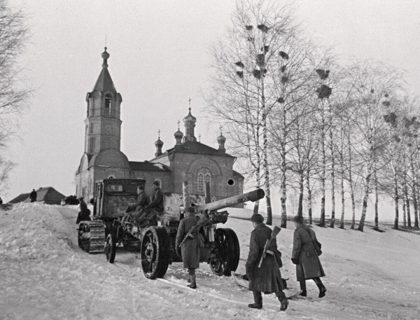 Soviet A-19 field gun being towed by a tractor in the village of Izvekova near Vyazma, Russia, 1 Mar 1943