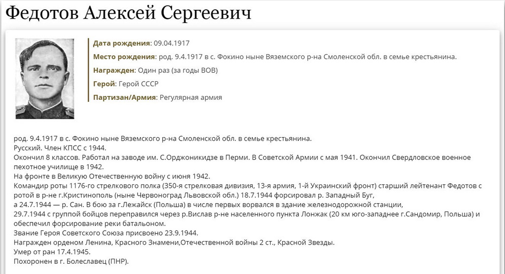 23 сентября 1944 года Указом Президиума Верховного Совета СССР уроженец вяземской земли Федотов Алексей Сергеевич удостоен звания Героя Советского Союза.