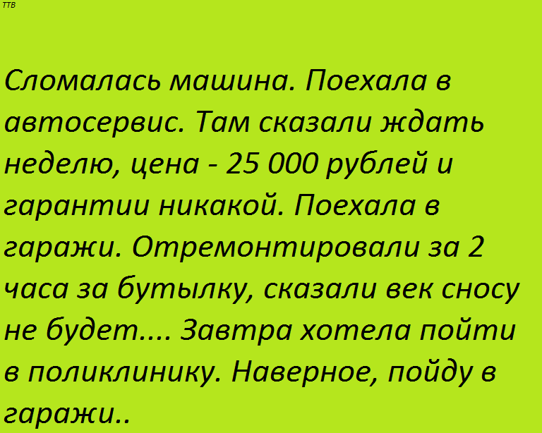 — Вашу мать! Кто вчера в опергруппе дежурил?!! — А что случилось? В чем дело? Смотрю, Палыч окончательна озверевает: — Кто вчера в опергруппе дежурил?!! Встает Кудряш: — Я, товарищ капитан. Палыч: — Ты на вызов ездил! Кудряш: — Так точно, товарищ капитан. Палыч: — Покойницу забирал! Кудряш: — Забирал… (смотрю задумчивей все Кудряш становится) Палыч (с надрывом в голосе): — НУ?! Кудряш: — Николай Павлович, ну я её это… в морг отвез, там сторож один был, мне её пришлось самому затаскивать. (сторожа в нашем приюте по обыкновению в умат пьяные). Палыч: — Ты дальше рассказывай лейтенант. Кудряш: - Ну в морге мест не было… А она ведь старушка, не мог уж я её на пол бросить… Ну я её на стул посадил около сторожа, а она сползает… Я верёвкой её и привязал, в одну руку ей паспорт положил, в другую постановление на вскрытие… К моменту когда Кудряш закончил ржали уже все, именно ржали. Палыч: - Мало того, что сторож ей всю ночь анекдоты рассказывал, так с утра пришла уборщица, тоже бабка кстати… попросила твою бабку чтобы она ноги подняла, бабка молчит… уборщица подумала, что бабка заснула и толкнула ее ноги шваброй, когда уборщица поняла, что бабка умерла, то она сразу потеряла сознание и падая зацепила документы, которые аккурат упали на уборщицу… Санитары думая, что уборщица и есть покойник, так как документы лежали на ней. Погрузили ее на каталку и отвезли на вскрытие, где ее раздели и положили на стол для вскрытия. В это время, пришли студенты 1 курса с медучилища, присутствовать при вскрытии, окружили уборщицу и преподаватель собираясь сделать первый надрез, повернул уборщице голову, в этот момент она открыла глаза и очнулась. В обморок упали все, даже преподаватель. |