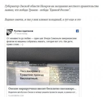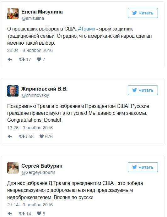 Но жалко смотреть на ваши кривлянья. Привыкли по указке ТВ видеть в вашей Америке врага - так привычно и удобно было списывать на неё свою отсталость - "во всём Америка виновата"... А поезд-то давно уехал. Теперь всё ровно наоборот. Это весь мир в шоке от Америки, а гости на "Эхе" выборы Трампа иначе как "идиотизмом" не называют. Европа, мягко говоря, в сдержанном недоумении... И только одна Россия в полном восторге! Госдума аплодирует победе Трампа, ЛДПР закатили банкет с шампанским в Кремле. Путин чуть ли не первым поздравил Трампа и американский народ! - "Россия готова и хочет восстановления отношений!"... Как же так? Как это Россия за один день захотела восстановления, если несколько лет подряд только надругалась над всем американским, и грозила по ТВ превратить Америку в "радиоактивный пепел"... Российские ювелиры через МИД передают подарок дорогому Трампу - золотой айфон с его портретом и лозунгом "Сделаем Америку великой вновь!" Ха-ха-ха! ![]() ![]() подробнее: http://echo.msk.ru/blog/znak_com/1871686-echo/ Как будто нужны Трампу эти побрякушки!)) Какая же мелочность и стыдное подлизывание к Америке!.. Так что, что-то вы отстали ребята. Про Америку плохо теперь - низя-я-я-я... Да и тема не та. Тут про СМИ. А вы создайте тему про выборы, и идите туда с Госдумой и вашей Америкой. Дай Бог, конечно, если отношения с Америкой исправятся. Только вы-то не позорьтесь, интересуйтесь хоть чем-то, следите за новостями, не перепутайте "генеральную линию партии"... Вы про Эрдогана-то слышали? Тоже был такой турецкий злодей, а сегодня - друг и партнёр. (и слава Богу.) |