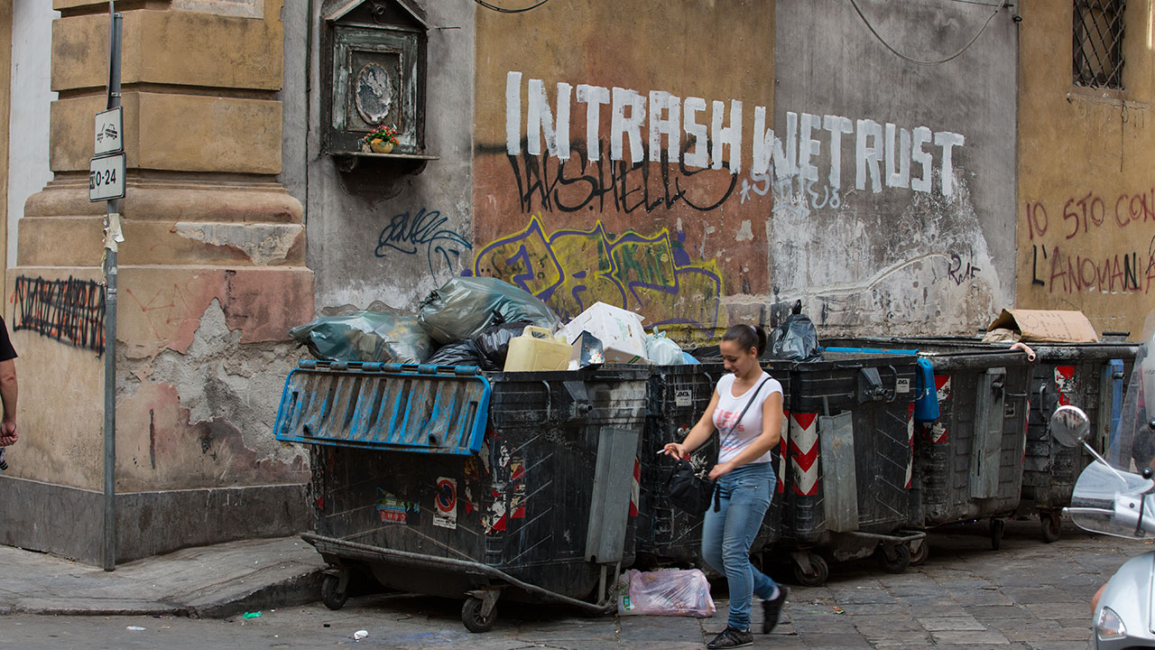 Вот так выглядят мусорные бачки в Вероне. Чисто, аккуратно, не нужно городить бетонную изгороду вокруг. Достаточно поставить культурные пластиковые бачки и вывозить их хотя бы через день. Всё зависит от руководства города ну и руководителя мусорной компании. У нас видно руководитель компании по вывозу мусора - говно полное, не умеющее организовать работу во вверенной ему организации, потому и город весь в мусоре. Это чувствуется например в Неаполе. Те же пластиковые бачки, но также как и у нас с горами мусора вокруг них.