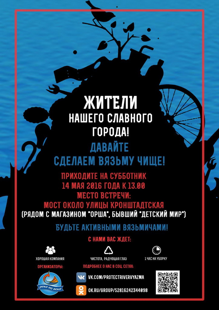 Вязьма-город воинской славы!!! — Asya Amelina 12:42 Уважаемые жители города, 04.06.2016 мы организовываем субботник по уборке берегов реки Вязьмы! Он будет проходить с 13.00 до 14.00 часов на набережных у Григорьевского моста по ул. Набережная и ул. Кирова (за кафе "Чайная"). РЕБЯТА, ДРУЗЬЯ, ПРИХОДИТЕ!!!! Гисметео обещает солнечно, +20: https://www.gismeteo.ru/city/daily/4223/4/ Каждый участник может внести свой вклад в общее дело! Расскажите друзьям! Добавляйтесь в нашу группу! |
