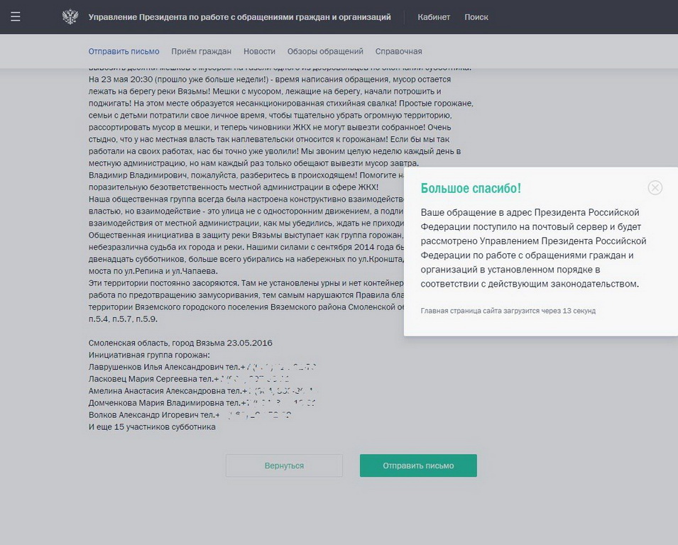 Президенту Российской Федерации Уважаемый Владимир Владимирович, группа граждан, представляющая общественную инициативу в защиту реки Вязьмы, обращается к Вам с просьбой о поддержке наших начинаний, направленных на благоустройство и поддержание благоприятного экологического состояния берегов реки Вязьмы, а именно: обратить внимание на вопиющую халатность и бездействие отдела ЖКХ администрации МО "Вяземский район" в части вывоза скоплений мусора, собранного силами горожан-добровольцев на субботнике 14 мая 2016 года по уборке берегов реки Вязьмы. Представитель администрации - заместитель начальника управления ЖКХ, транспорта и дорожного хозяйства господин Иваненко, а также начальник управления господин Лосев, обещали представителям общественной инициативы горожан начать вывозить мусор (33 крупных мешков, фото прилагаем), собранный на субботнике, 16-17 мая. Именно по этой причине мы не стали вывозить десятки мешков с мусором на газели одного из добровольцев по окончании субботника.Владимиру Владимировичу Путину Открытое обращение На 23 мая 20:30 (прошло уже больше недели!) - время написания обращения, мусор остается лежать на берегу реки Вязьмы! Мешки с мусором, лежащие на берегу, начали потрошить и поджигать! На этом месте образуется несанкционированная стихийная свалка! Простые горожане, семьи с детьми потратили свое личное время, чтобы тщательно убрать огромную территорию, рассортировать мусор в мешки, и теперь чиновники ЖКХ не могут вывезти собранное! Очень стыдно, что у нас местная власть так наплевательски относится к горожанам! Если бы мы так работали на своих работах, нас бы точно уже уволили! Мы звоним целую неделю каждый день в местную администрацию, но нам каждый раз только обещают вывезти мусор завтра. Владимир Владимирович, пожалуйста, разберитесь в происходящем! Помогите нам побороть поразительную безответственность местной администрации в сфере ЖКХ! Наша общественная группа всегда была настроена конструктивно взаимодействовать с местной властью, но взаимодействие - это улица не с односторонним движением, а подлинного взаимодействия от местной администрации, как мы убедились, ждать не приходится! Общественная инициатива в защиту реки Вязьмы выступает как группа горожан, которым небезразлична судьба их города и реки. Нашими силами с сентября 2014 года было проведено двенадцать субботников, больше всего убирались на набережных по ул.Кронштадтской, около моста по ул.Репина и ул.Чапаева. Эти территории постоянно засоряются. Там не установлены урны и нет контейнеров, не ведется работа по предотвращению замусоривания, тем самым нарушаются Правила благоустройства на территории Вяземского городского поселения Вяземского района Смоленской области, п.5.1, п.5.4, п.5.7, п.5.9. Смоленская область, город Вязьма 23.05.2016 Инициативная группа горожан: Лаврушенков Илья Александрович Ласковец Мария Сергеевна Амелина Анастасия Александровна Домченкова Мария Владимировна Волков Александр Игоревич И еще 15 участников субботника......... |
