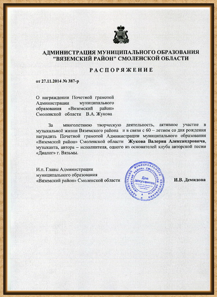 В преддверии юбилея... Жуков Валерий – музыкант, гитарист, аранжировщик, автор-исполнитель, актёр ТЮЗа, автор песен о Вязьме, один из основателей клуба авторской песни «Диалог» г. Вязьма. В разные годы своего жизненного и творческого пути являлся и по сей день является активным участником различных творческих коллективов Вязьмы. Творческая деятельность Валерия началась ещё в школьные годы и сейчас насчитывает 44 года и это - далеко не предел! "14 декабря (воскресенье) приглашаем на 60-летие Валерия ЖУКОВА -музыканта от Бога, самородка, автора-исполнителя, гитариста и аранжировщика песен. На малой сцене Вяземского Народного театра соберутся музыканты и творческая интеллигенция нашего города, люди с которыми Валерий Жуков в разные годы выходил на одну сцену для выступлений, поднимался на одни подмостки в спектаклях. Творческий вечер «Где моя половина души…», посвящённый 60-летию Валерия Жукова берёт своё название по первой строчке одной из самых известных и любимых слушателями песен автора. Творческий вечер пройдёт в два отделения с участием клуба авторской песни «Диалог», вокально-инструментального ансамбля «Кривичи», группы «Ритуал», фольклорного ансамбля «Иван да Марья», актёров Народного Театра юного зрителя и Вяземского Народного театра, поэтов и музыкантов, друзей юбиляра. Валерий Жуков является одним из основателей нашего клуба авторской песни «Диалог», поэтому мы с особой теплотой и заботой готовим этот праздник для него. Начало в 16:00." Лидия Чинарёва |